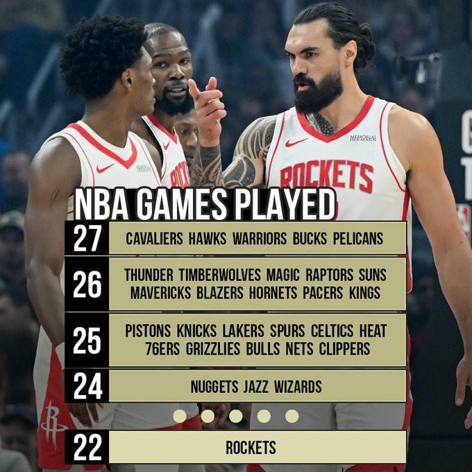 在已经进行的赛程中,火箭队仅进行了22场,相比并列第二少的掘金、爵士和奇才还要少2场,与此同时,有五支球队已经打了27场比赛。