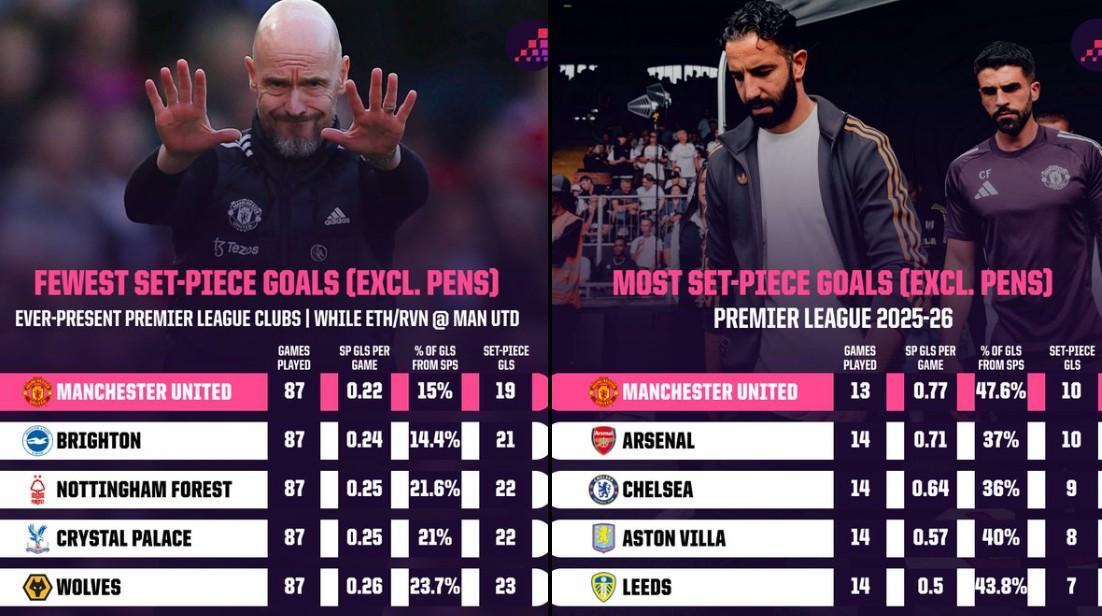 本赛季至今,曼联在定位球方面的表现取得了巨大的进步,此前滕哈格执教时曼联的定位球饱受诟病,Opta盘点了滕哈格、阿莫林时代曼联定位球进球数对比。